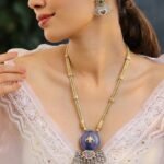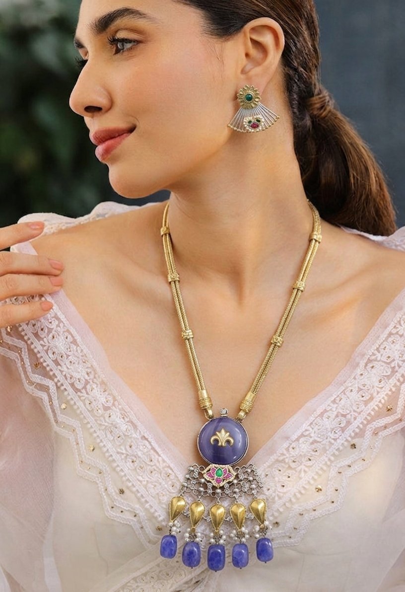 This elegant two-tone necklace set is a beautiful blend of gold and silver finishes, designed to create a unique and graceful look. The necklace features a sleek golden chain with delicate decorative accents placed along the length, giving it a refined and polished appearance. At the center sits a round violet stone pendant that instantly catches the eye and adds a soft touch of color to the overall design. The smooth stone is highlighted with a subtle golden motif that enhances its royal charm.