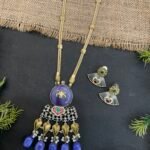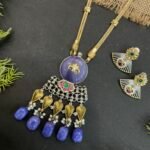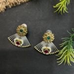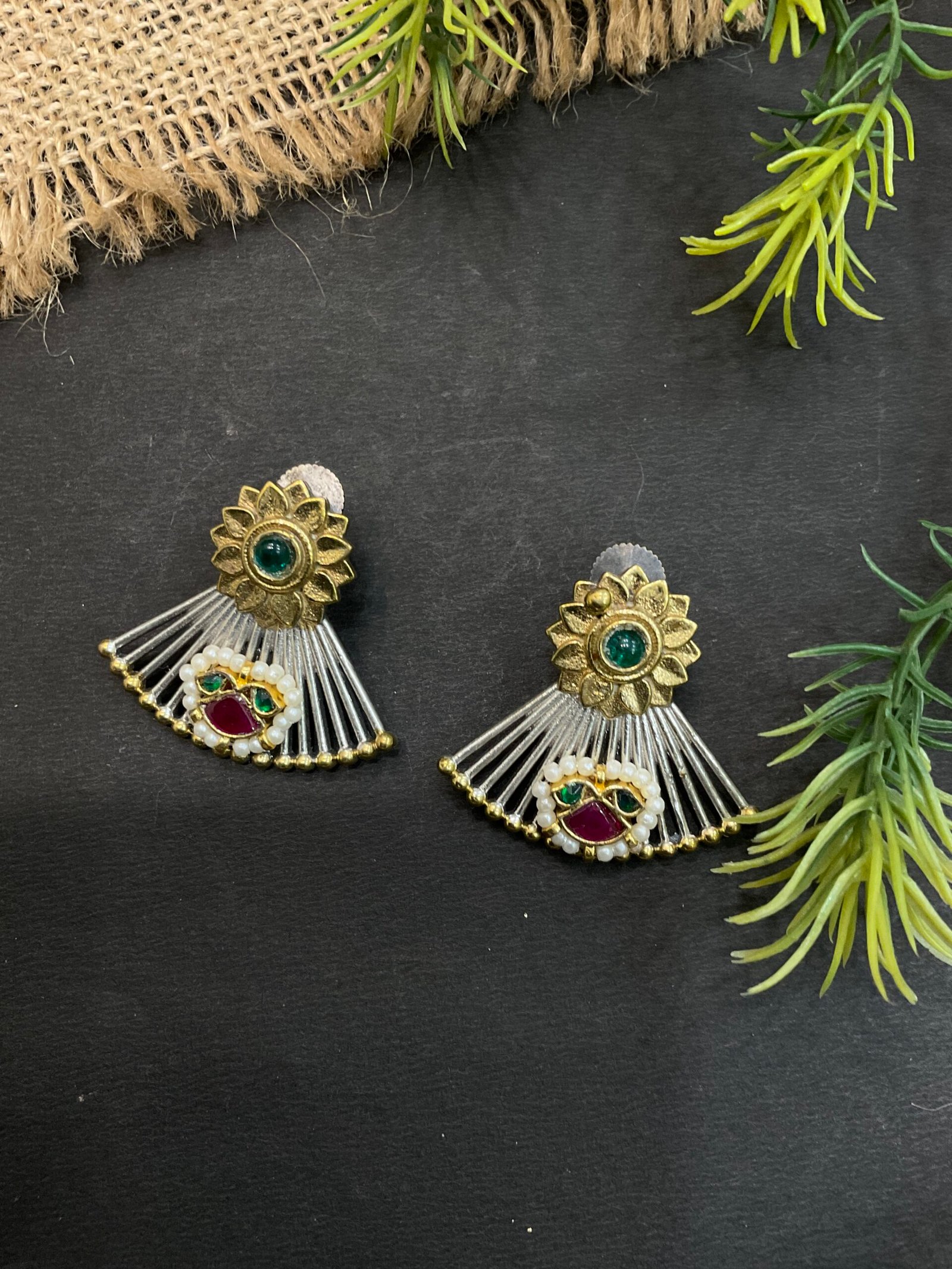 The matching earrings perfectly complement the necklace with a floral-inspired top, silver fan-shaped detailing, and small colorful accents that tie the whole set together beautifully. This two-tone necklace set is perfect for festive occasions, family gatherings, weddings, and special celebrations. It pairs wonderfully with sarees, suits, and fusion outfits, adding a sophisticated and artistic touch to your overall look.