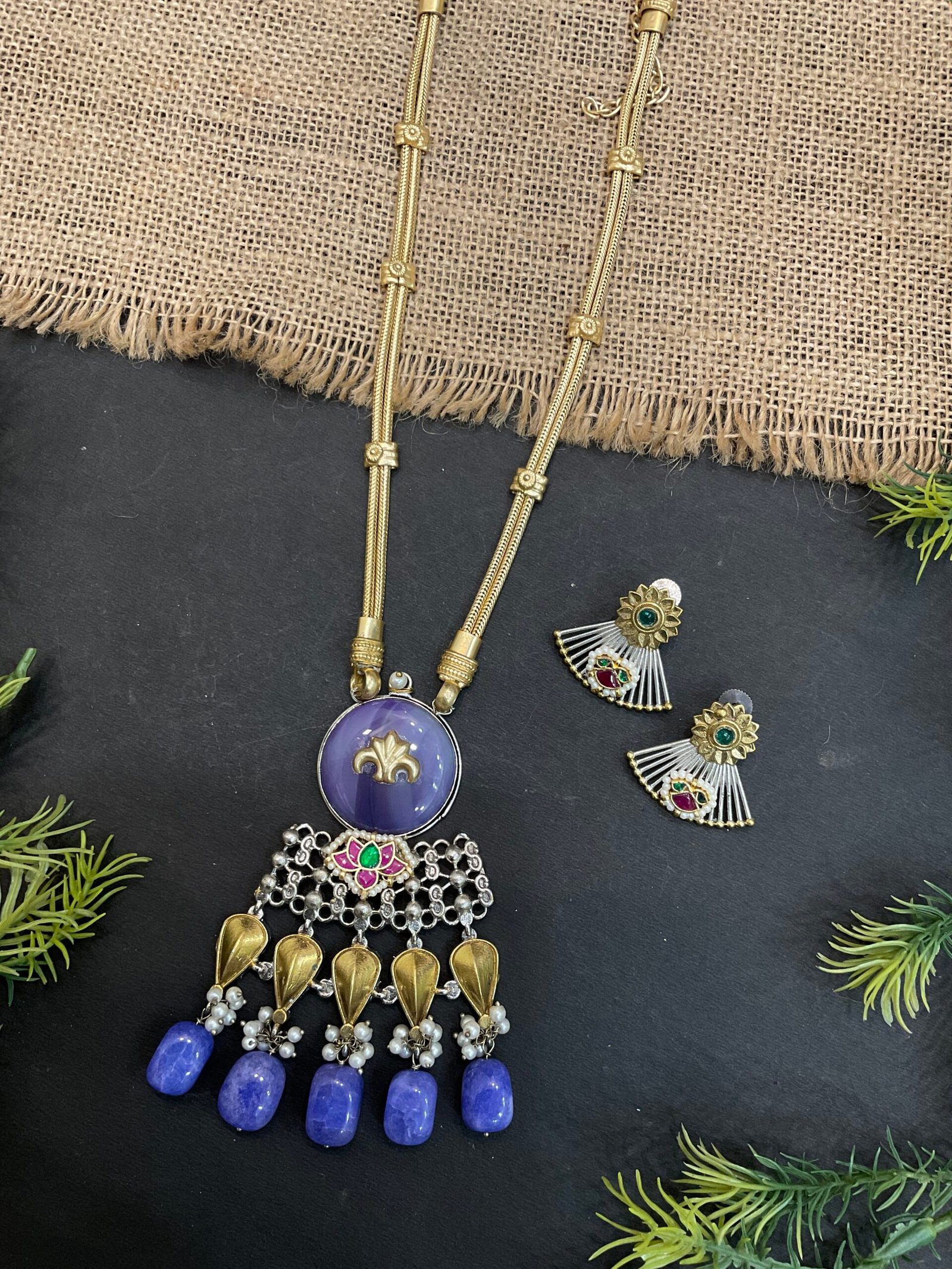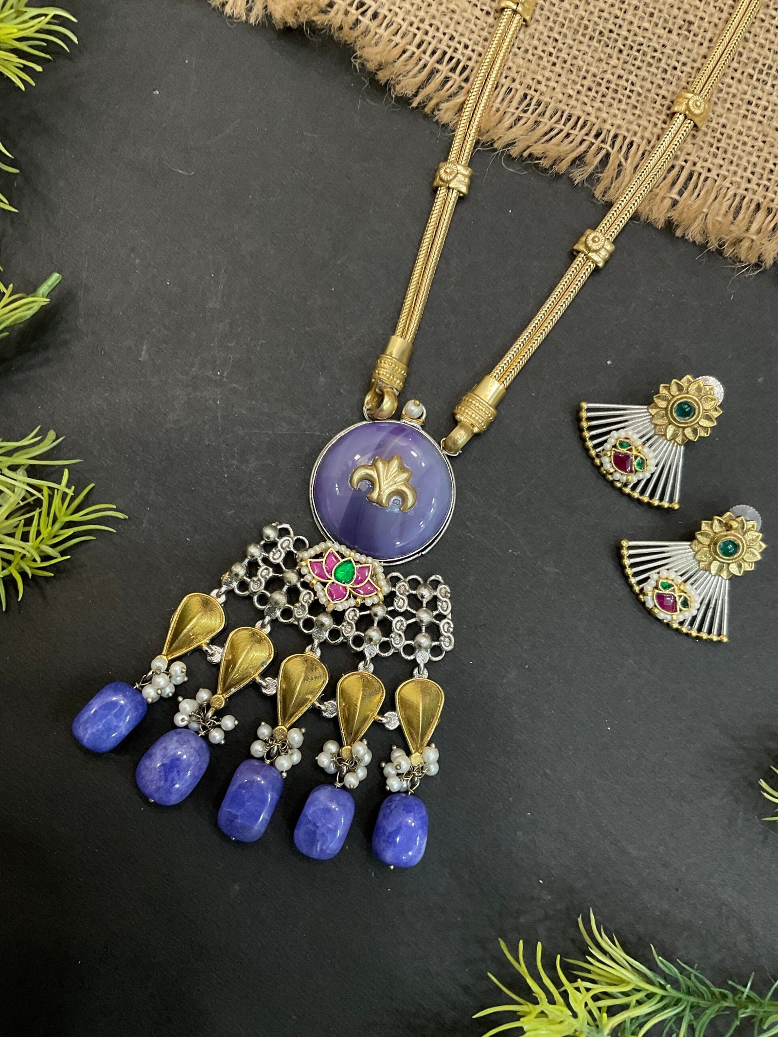Below the central stone, the pendant is decorated with intricate silver detailing that creates a delicate lace-like pattern. Small colorful enamel accents in pink and green add a traditional touch, while gold-toned leaf-shaped charms bring warmth to the design. Hanging at the bottom are deep violet bead drops paired with tiny pearl clusters, creating gentle movement and making the necklace look even more stylish and luxurious.